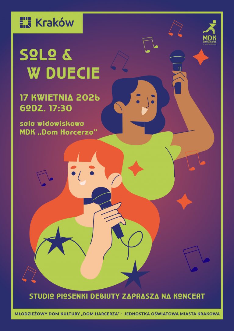 Zapraszamy na koncert „Solo & w duecie”, przygotowany przez Studio Piosenki Debiuty działające w Młodzieżowym Domu Kultury „Dom Harcerza”, ul. Reymonta 18 w Krakowie. -