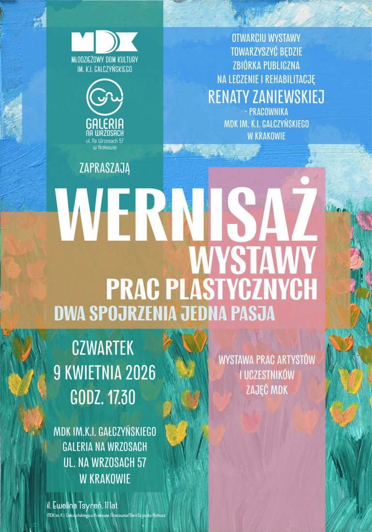 Zapraszamy na wernisaż wystawy prac plastycznych pt. „Dwa spojrzenia, jedna pasja”, który odbędzie się w czwartek, 9 kwietnia 2026 roku o godz. 17:30 w Galerii Na Wrzosach przy ul. Na Wrzosach 57 w Krakowie. Wystawa prezentuje… -