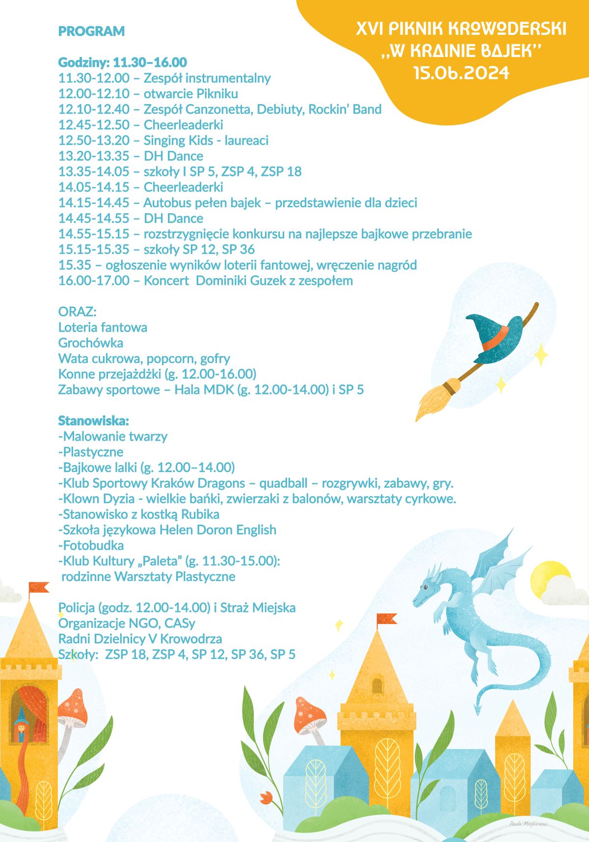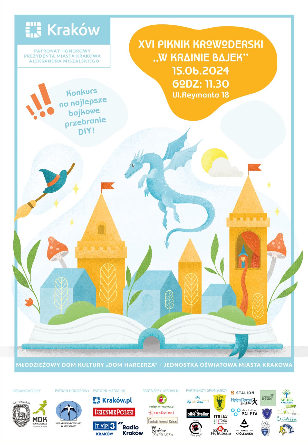Już 15 czerwca 2024 roku zapraszamy Was na XVI Piknik Krowoderski - W krainie bajek. W ramach Pikniku zabawy, warsztaty cyrkowe, foto budka, warsztaty plastyczne, przejażdżki konne, malowanie buziek, występy, koncert bajkowych przebojów, konkurs na najpiękniejsze bajkowe przebranie wykonane przez Was! I wiele innych atrakcji z loterią na czele, w której w tym roku czaka na Was mnóstwo fantastycznych nagród. Organizatorem Pikniku jest Rada Dzielnicy V Miasta Krakowa i Młodzieżowy Dom Kultury „Dom Harcerza” przy ul. Reymonta 18.