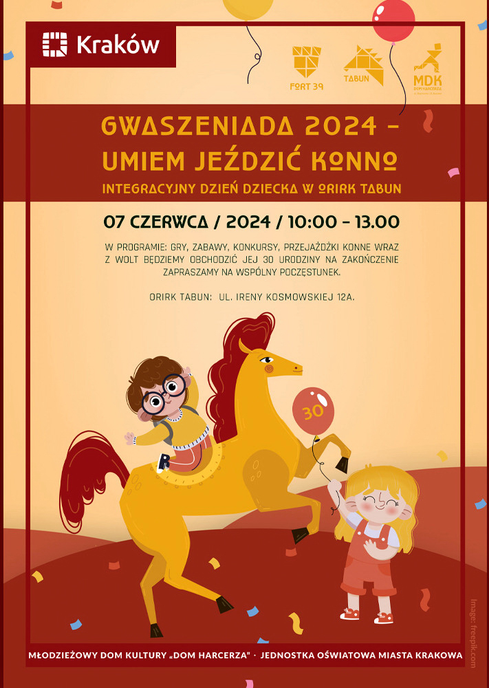 7 czerwca 2024 roku, w godz. 10-13 zapraszamy serdecznie uczestników naszych tabunowych zajęć do ORiRK Tabun na Integracyjny Dzień Dziecka - Gwaszeniada 2024. W programie: gry, zabawy, konkursy, przejażdżki konne oraz wspólny poczęstunek.