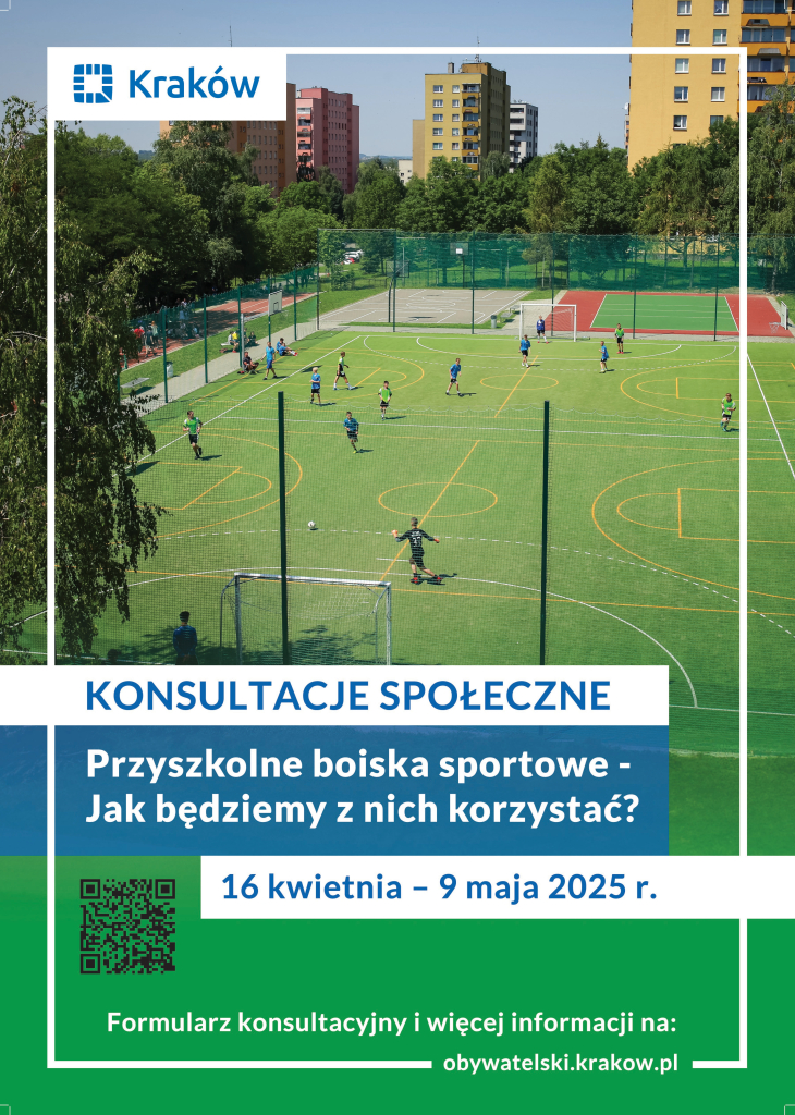 Prezydent Krakowa zaprasza mieszkanki i mieszkańców miasta do wzięcia udziału w konsultacjach społecznych dotyczących projektu uchwały Rady Miasta Krakowa w sprawie zasad i trybu korzystania z przyszkolnych boisk sportowych, które odbędą się w dniach 16 kwietnia – 9 maja 2025 r. Projekt uchwały jest intencją Prezydenta zmierzającą do uregulowania zasad i trybu korzystania z przyszkolnych boisk sportowych stanowiących własność Gminy Miejskiej Kraków, tak aby zapewnić ich właściwe użytkowanie, bezpieczeństwo oraz szeroką dostępność zarówno dla uczniów szkół, jak i mieszkańców Krakowa.