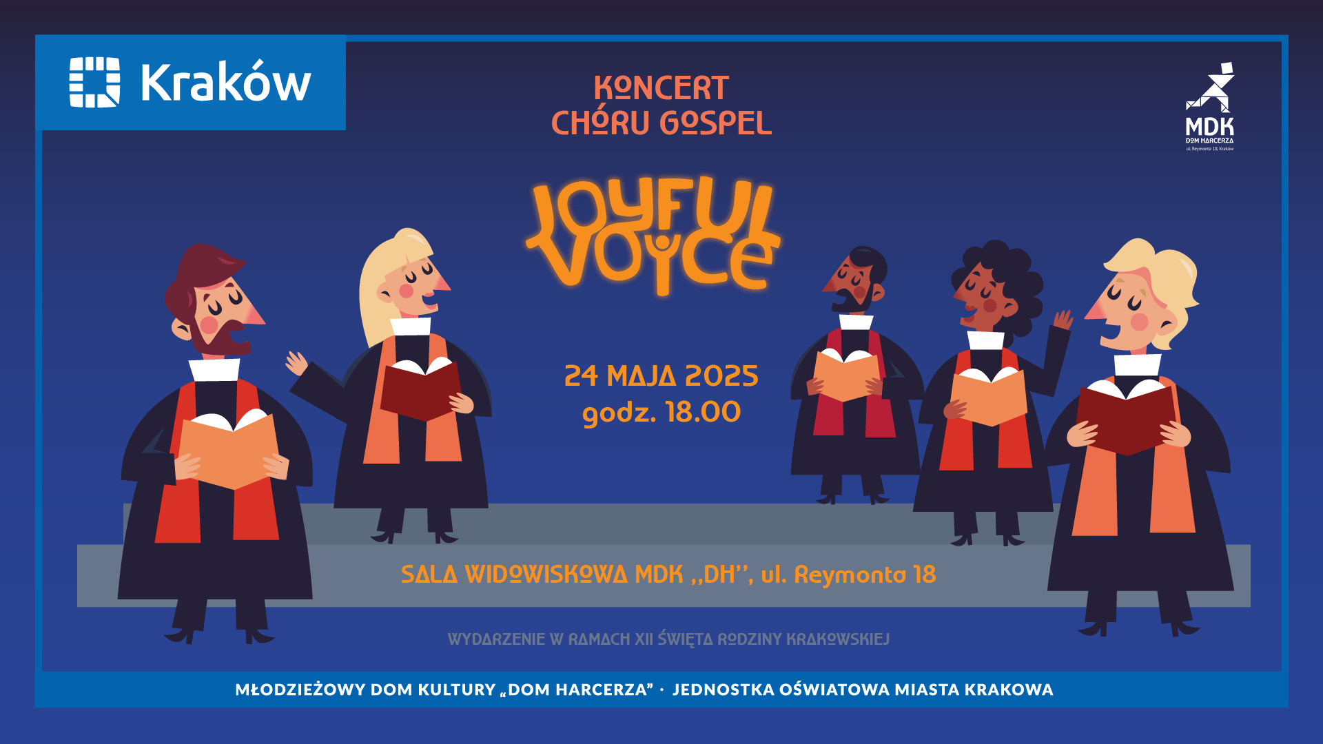 Serdecznie zapraszamy na koncert chóru Joyful Voice, który odbędzie się w sobotę 24 maja 2025 roku o godz. 18.00 w sali widowiskowej Młodzieżowego Domu Kultury „Dom Harcerza” Reymonta 18.