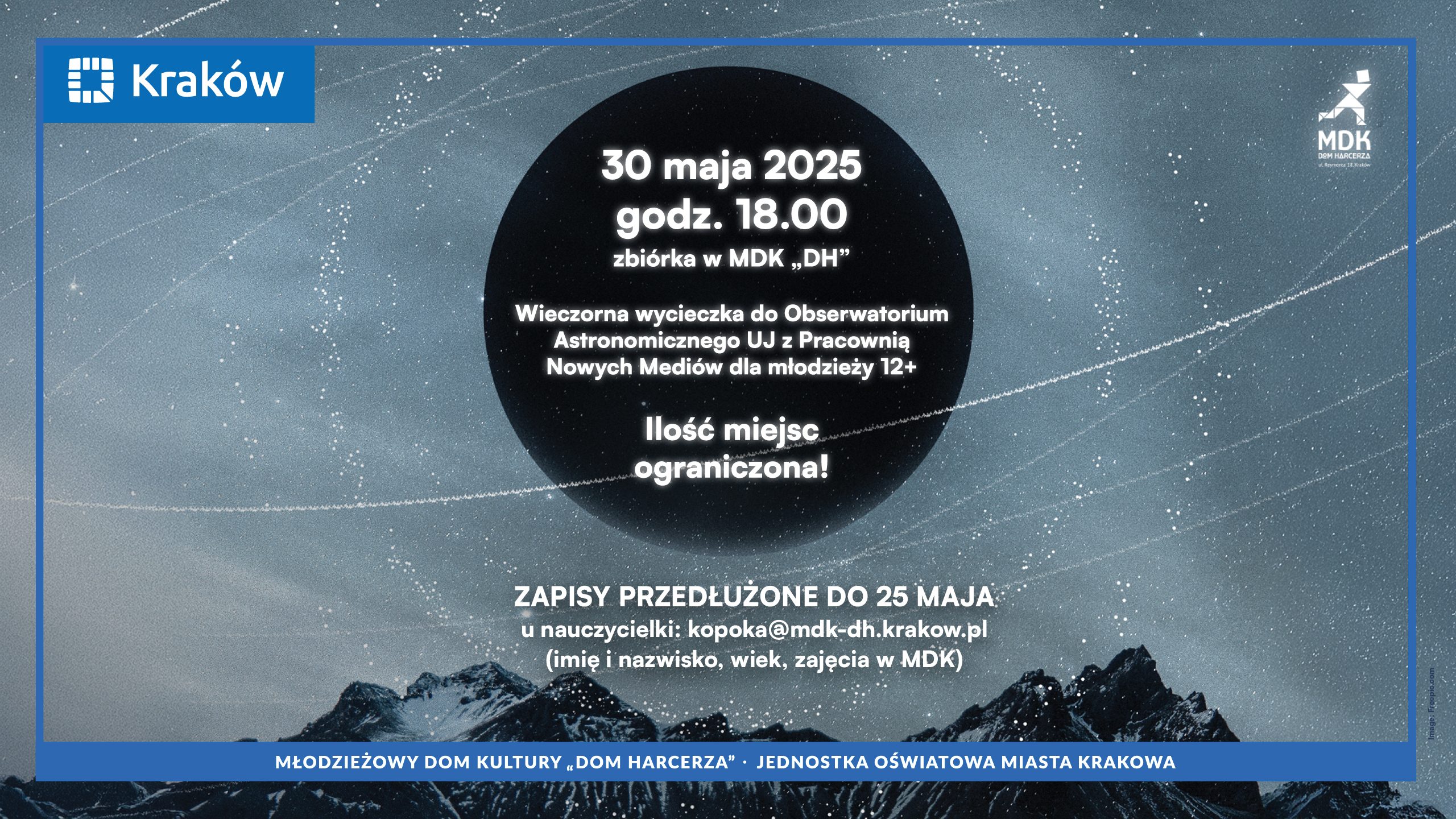 30 maja 2025 roku o godz. 18.00 zapraszamy młodzież 12+ na wieczorną wycieczkę do Obserwatorium Astronomicznego Uniwersytetu Jagiellońskiego. Zbiórka uczestników odbędzie się w MDK „Dom Harcerza” przy ul. Reymonta 18.