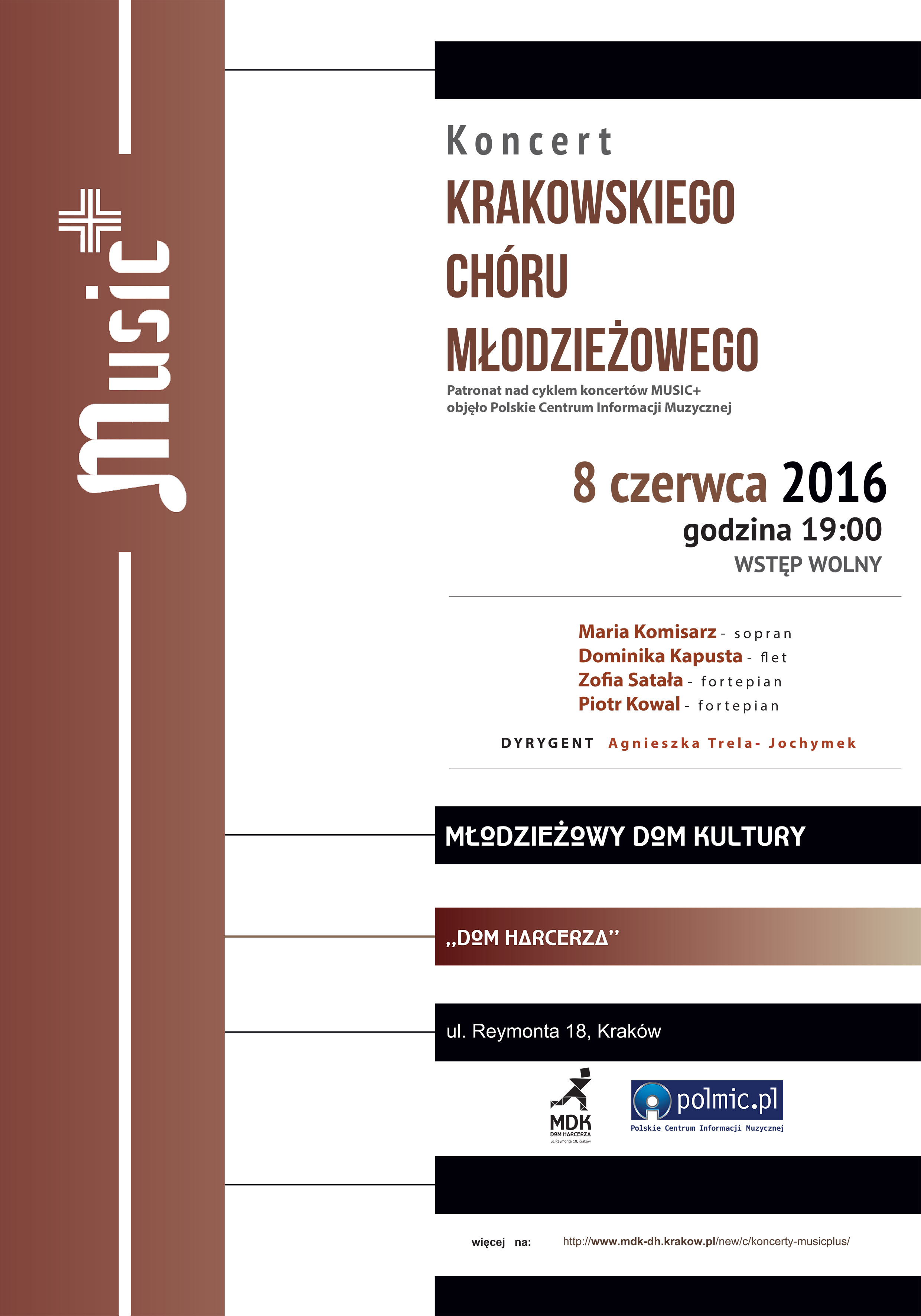 8 czerwca 2016 roku o godz. 19.00 zapraszamy do MDK "Dom Harcerza" na koleiny z cyklu Music+ Koncert Krakowskiego Chóru Młodzieżowego pod kierunkiem Agnieszki Treli - Jochymek. Usłyszymy sopranistkę Marię Komisarz. Na fortepianie zagrają Zofia Satała i Piotr Kolwa, a na flecie Dominika Kapusta.