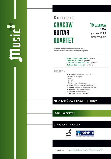 15 czerwca 2016 roku o godz. 19.00 zapraszamy na kolejny koncert z cyklu Music+. Wystąpi Cracow Guitar Quartet w składzie: Miłosz Mączyński, Joanna Baran, Łukasz Dobrowolski i Oskar Kozłowski. Wstęp wolny!