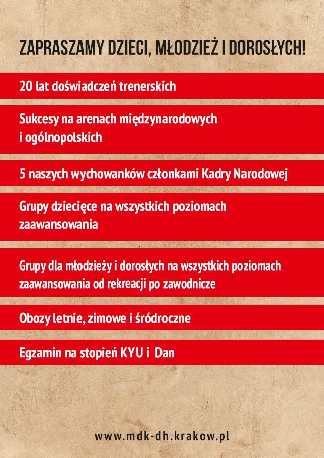 W imieniu własnym i wszystkich instruktorów zapraszam na trening inauguracyjny, który odbędzie się 27 września 2016 roku o godzinie 18.00 na nowej Hali Sportowej MDK „DH” w Krakowie, ul. Reymonta 18.