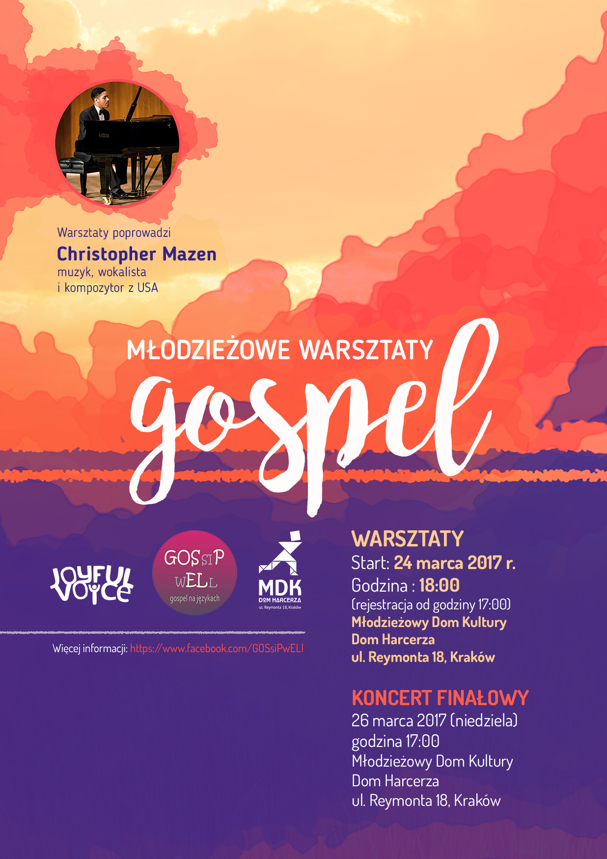 Już po raz trzeci zapraszamy młodzież (gimnazjalną i licealną) na Młodzieżowe Warsztaty Gospel w dniach 24-26 marca 2017 r w MDK Dom Harcerza w Krakowie przy ul. Reymonta 18. Warsztaty poprowadzi muzyk, wokalista i kompozytor z USA Christopher Mazen.
