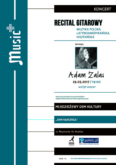 29 marca 2017 roku o godz. 19.00 zapraszamy do Młodzieżowego Domu Kultury „Dom Harcerza” przy ul. Reymonta 18 na recital gitarowy w wykonaniu Adama Zalasa. Zapraszamy!.