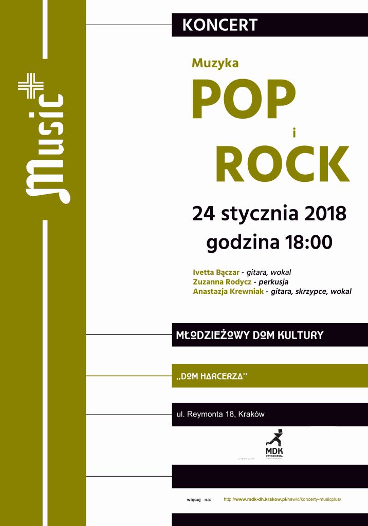 24 stycznia 2018 roku o godz. 18.00, w ramach cyklu Music+, zapraszamy na koncert zespołu młodzieżowego „Pop i Rock”. Wystąpią: Ivetta Bączar, Zuzanna Rodycz i Anastazja Krewniak. Wstęp Wolny!