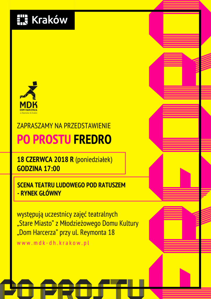 18 czerwca 2018 roku o godz. 17.00 na scenie Teatru Ludowego „Pod Ratuszem” odbędzie się przedstawienie „PO PROSTU FREDRO”. Wystąpią uczestnicy zajęć teatralnych "Stare Miasto" z naszego Młodzieżowego Domu Kultury. Zapraszamy!
