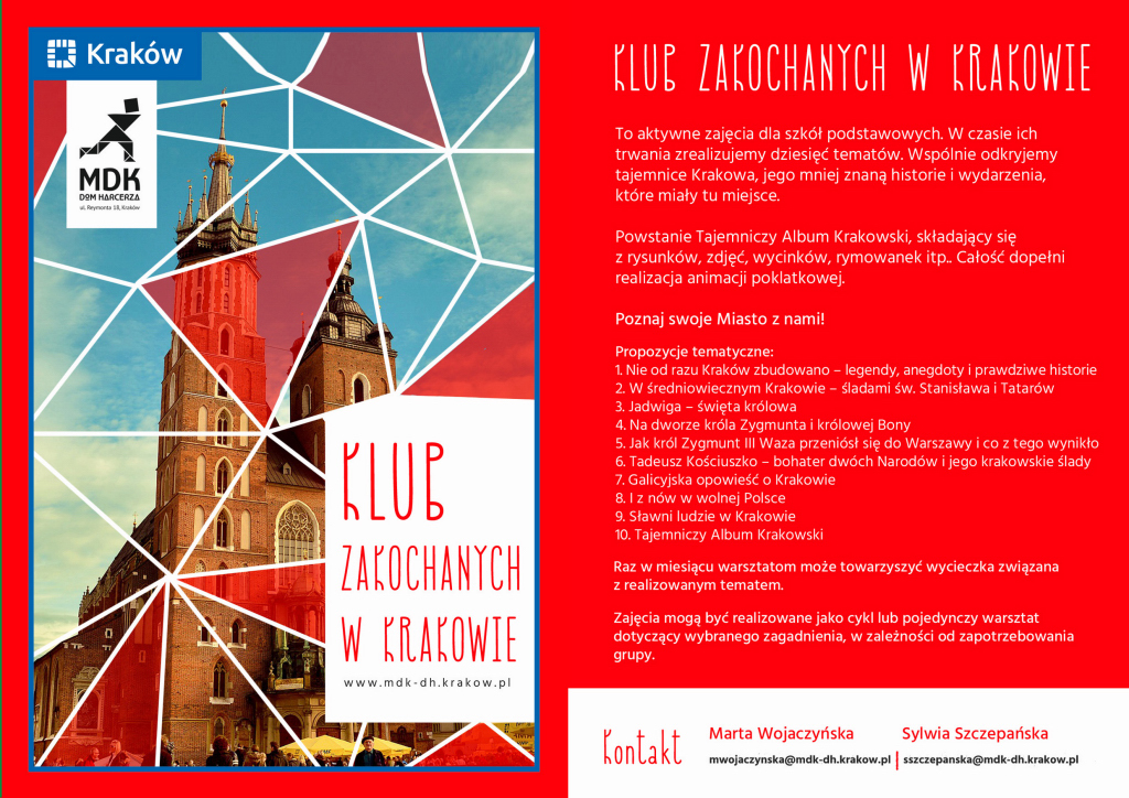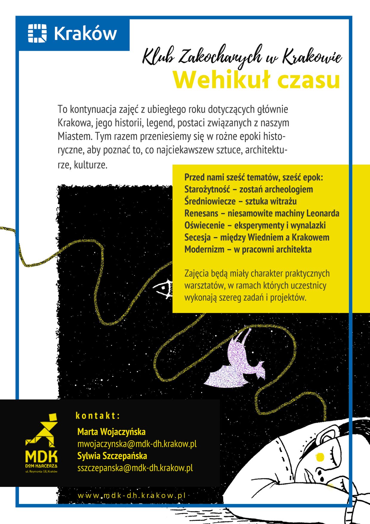 Klub Zakochanych w Krakowie - Wehikuł czasu, to kontynuacja zajęć z ubiegłego roku dotyczących głównie Krakowa, jego historii, legend, postaci związanych z naszym Miastem. Tym razem przeniesiemy się w rożne epoki historyczne, aby poznać to, co najciekawsze w sztuce, architekturze, kulturze.