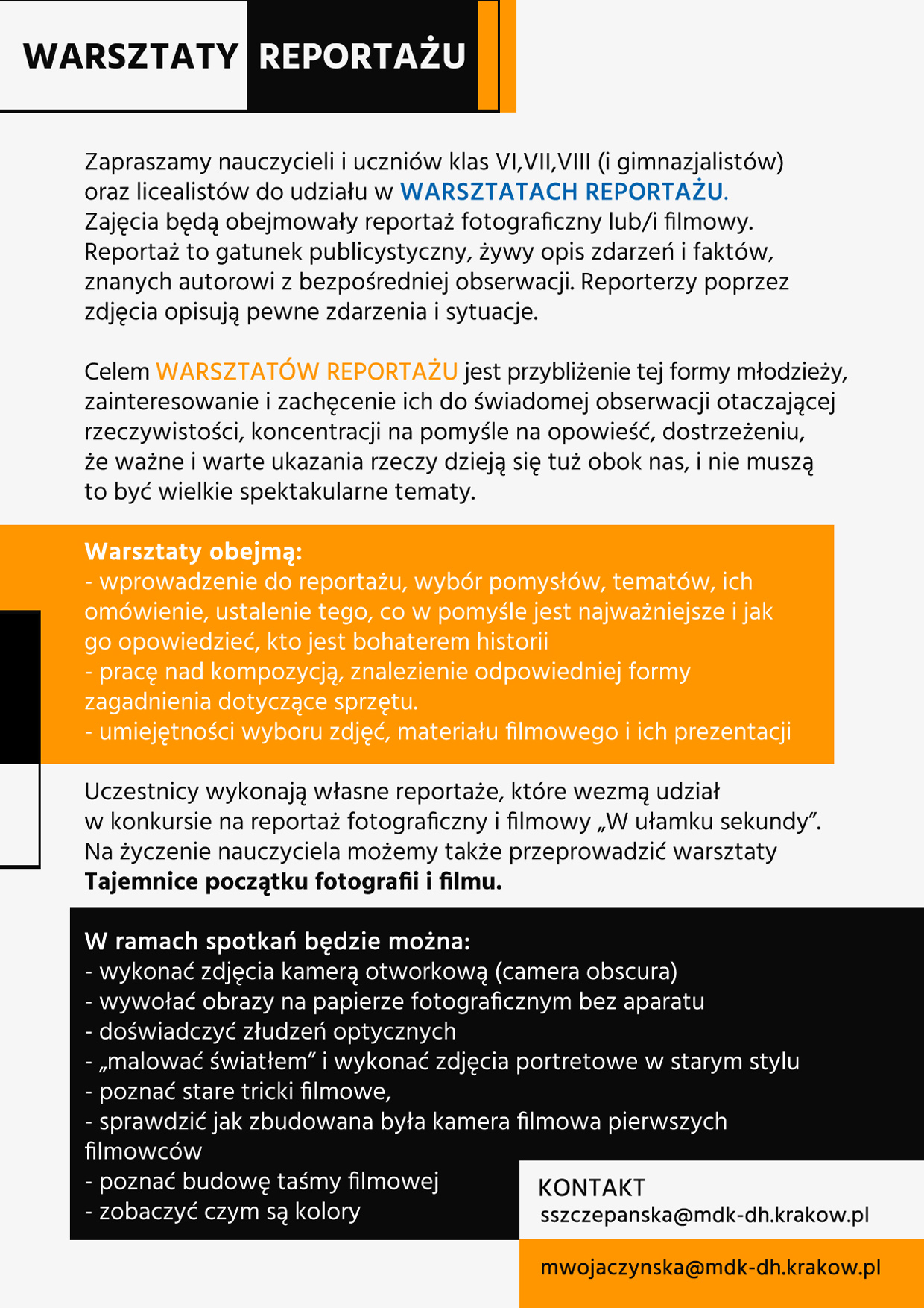 Zapraszamy nauczycieli i uczniów klas VI,VII,VIII (i gimnazjalistów) oraz licealistów do udziału w Warsztatach Reportażu. Zajęcia będą obejmowały reportaż fotograficzny lub/i filmowy