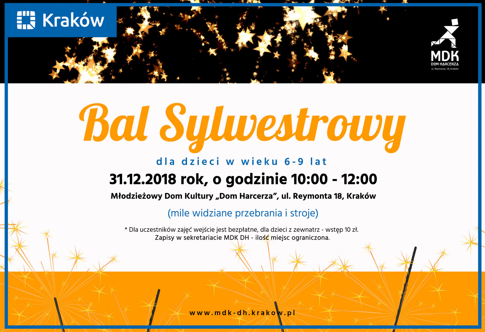 Zapraszamy dzieci w wieku 6-9 lat na Bal Sylwestrowy do MDK „Dom Harcerza” przy ul. Reymonta 18. Zabawa odbędzie się 31 grudnia 2018 roku o godz. 10.00. Mile widziane stroje i przebrania. Zapisy w sekretariacie MDK „DH”. Ilość miejsc ograniczona.