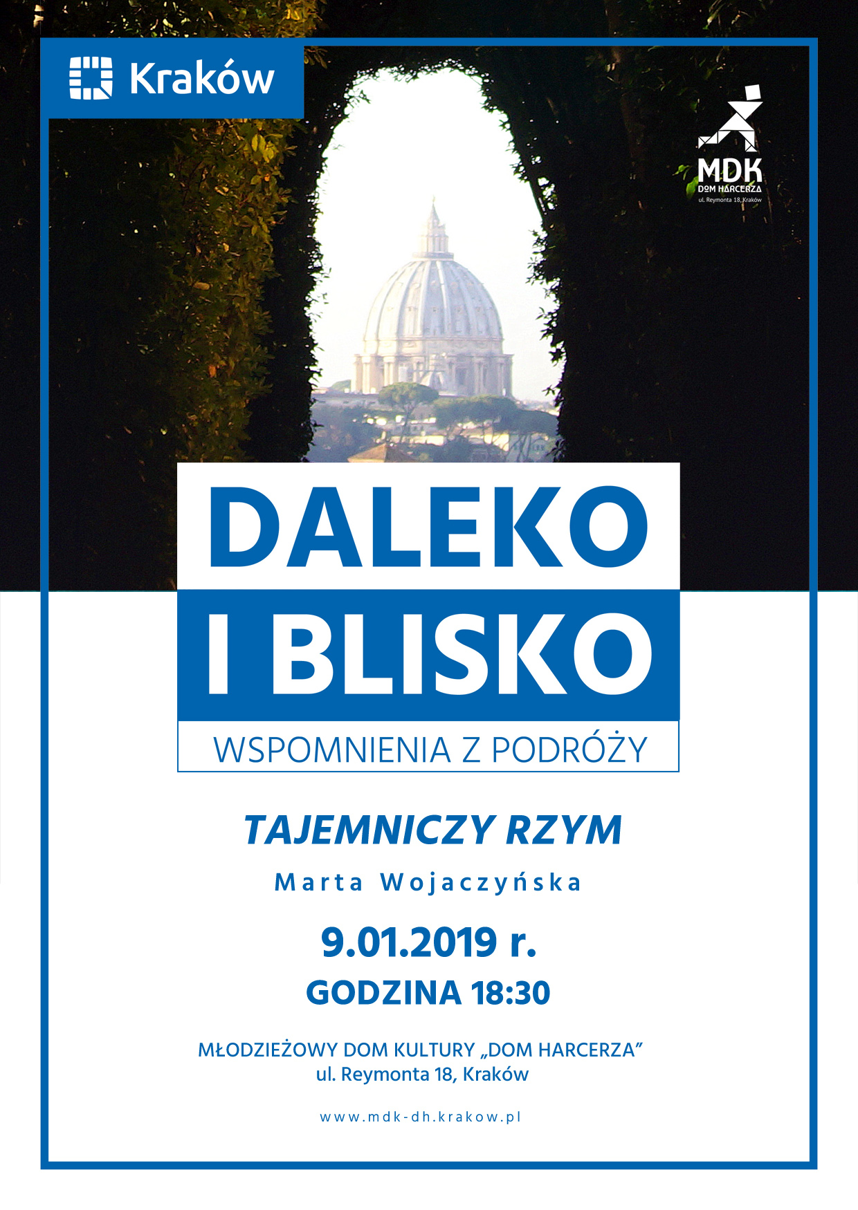 9 stycznia 2019 roku o godz. 18.30 zapraszamy do MDK „Dom Harcerza” na kolejne spotkanie Cyklu Podróżniczego „Daleko i blisko - wspomnienia z podróży". O swej wyprawie do Rzymu opowie Marta Wojaczyńska. Wstęp wolny!
