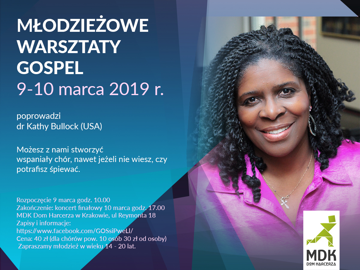 W dniach 9-10 marca 2019 roku zapraszamy młodzież w wieku 14-20 lat na „Młodzieżowe Warsztaty Gospel”, które poprowadzi dr Kathy Bullock z USA. Rozpoczęcie w sobotę o godz. 10.00. Koncert finałowy w niedzielę o godz. 17.00.