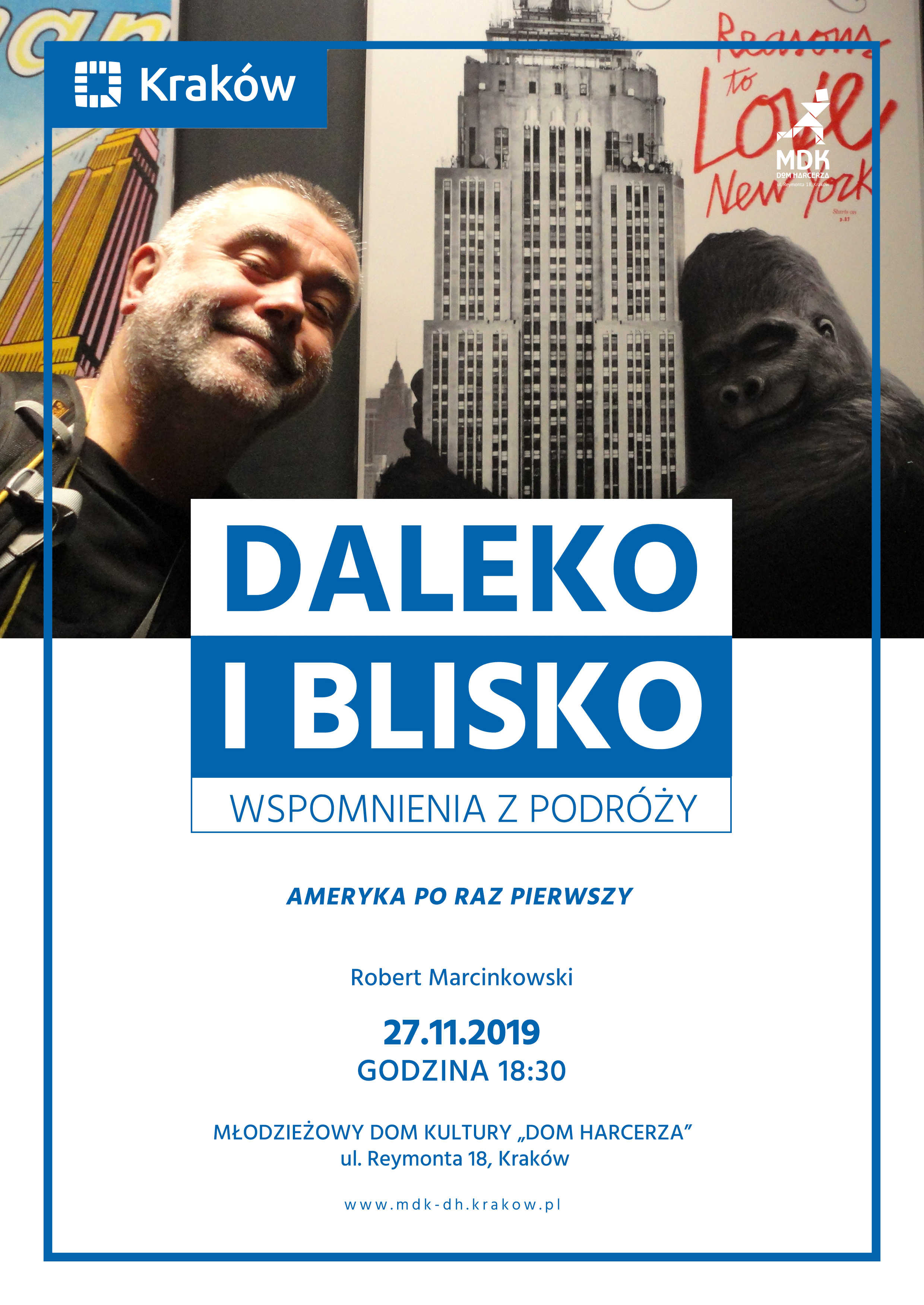27 listopada 2019 roku o godz. 18.30 zapraszamy do MDK „Dom Harcerza” na kolejne spotkanie Cyklu Podróżniczego „Daleko i blisko - wspomnienia z podróży". O wyprawie do USA opowie Robert Marcinkowski. Wstęp wolny!