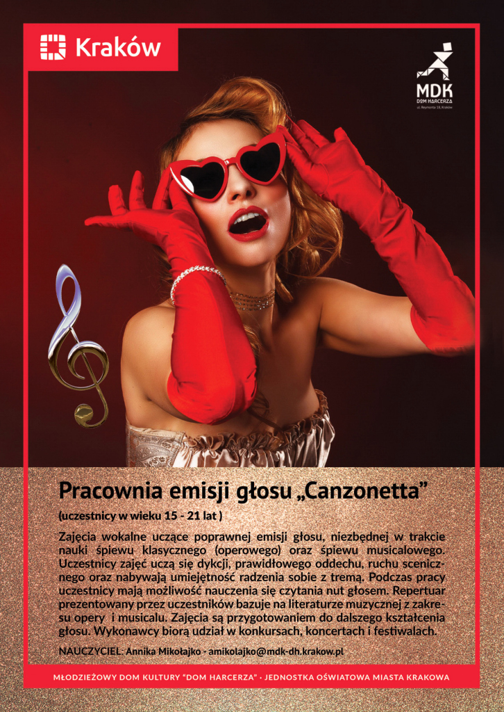 Otwieramy nową pracownię! Pracownia emisji głosu „Canzonetta" to zajęcia poprawnej emisji, które mogą być wstępem do nauki śpiewu musicalowego i operowego, a także mogą pomóc przygotować się do egzaminów do szkół muzycznych i szkół wokalno-aktorskich. Zajęcia są przeznaczone dla osób od 15 roku życia. Szczegóły pod mailem Ten adres pocztowy jest chroniony przed spamowaniem. Aby go zobaczyć, konieczne jest włączenie w przeglądarce obsługi JavaScript.