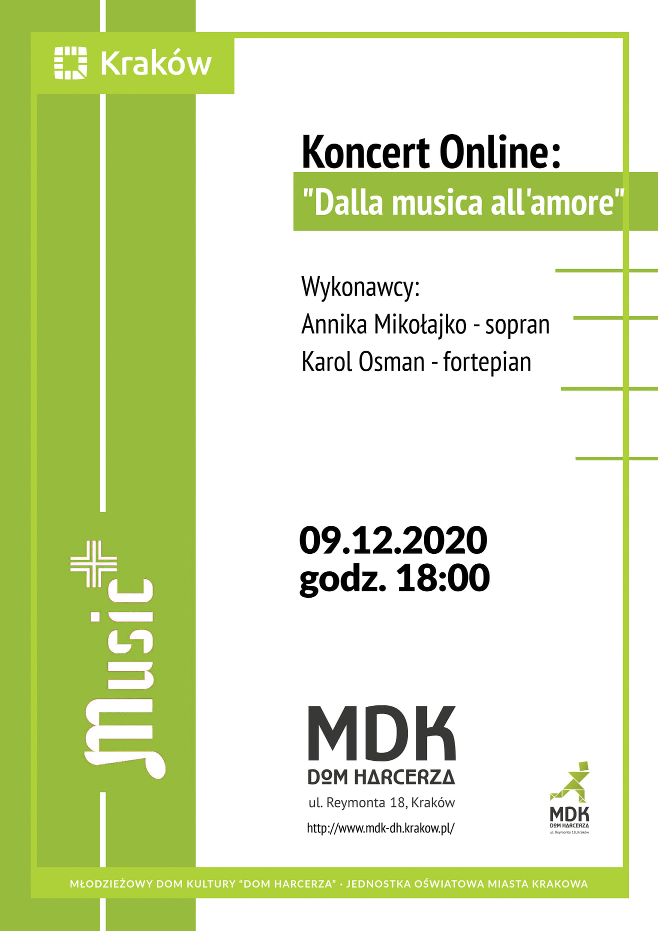 Serdecznie zapraszamy Państwa na koncert online „Dalla musica all'amore" zorganizowany w ramach projektu „Music+" Młodzieżowego Domu Kultury „Dom Harcerza". W koncercie wystąpi Annika Mikołajko oraz Karol Osman. Usłyszą Państwo utwory w różnych stylach muzycznych opowiadające o miłości. Będą to zarówno arie operowe, piosenki musicalowe, pieśni jak i utwory z gatunku poezji śpiewanej. Serdecznie zapraszamy na koncert od 9 grudnia 2020 roku od godziny 18stej.