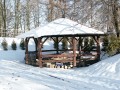 Zadaszona altanka z grillem to idealne miejsce na spotkania przy ognisku. Jej położenie zapewnia użytkownikom kameralny nastrój. Rozstawione wokół paleniska ławy pomieszczą około 30 osób.