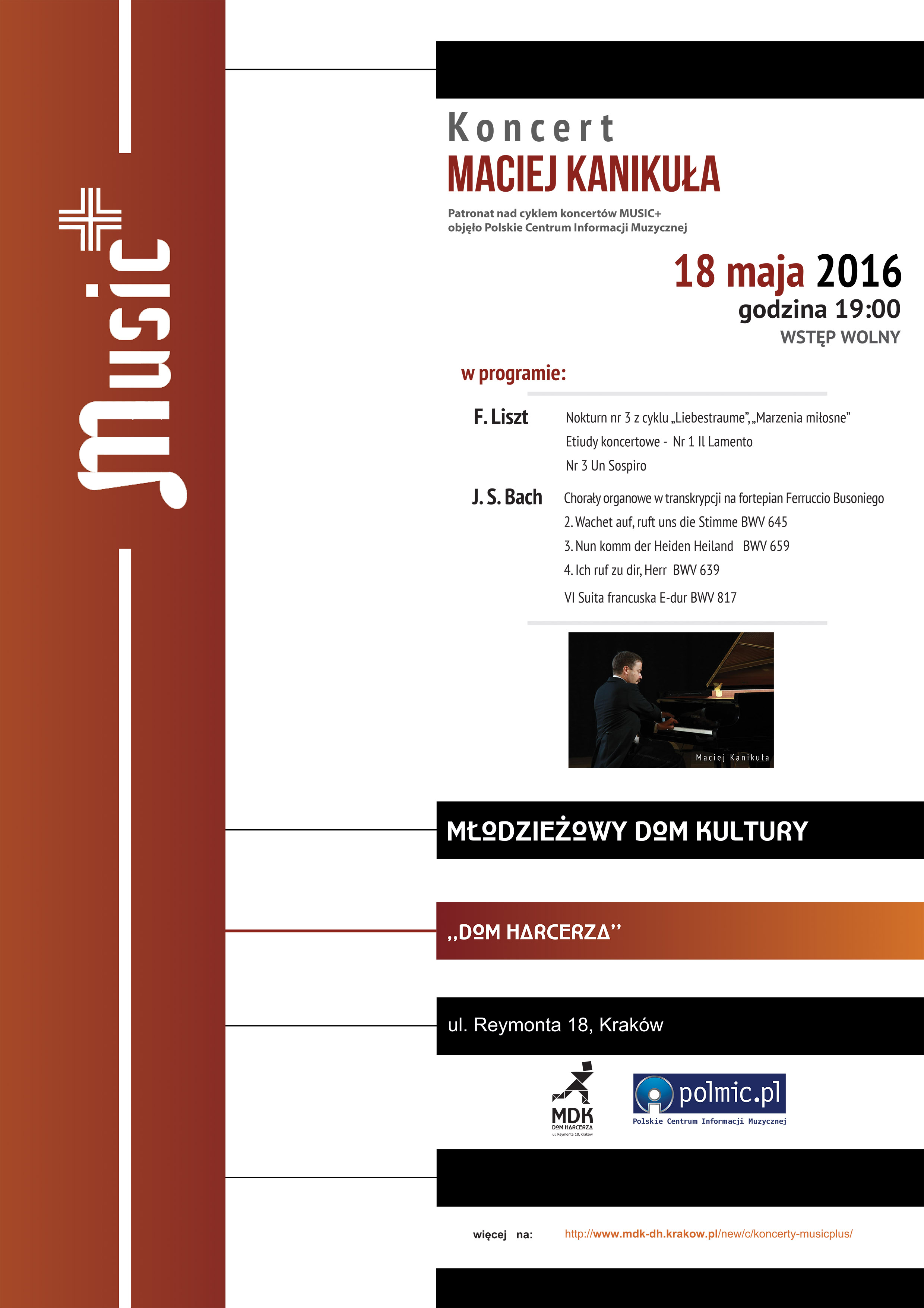 Zapraszamy na koncert fortepianowy z cyklu Music+ w wykonaniu Macieja Kanikuły, który odbędzie się 18 maja 2016 roku o godz. 19.00 w Młodzieżowym Domu Kultury „Domu Harcerza”, ul. Reymonta 18. Wstęp wolny!