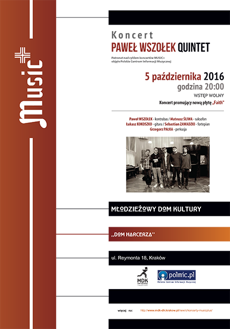 Zapraszamy na kolejny koncert z cyklu Music+, który odbędzie się 5 października 2016 roku o godz. 20.00 w Młodzieżowym Domu Kultury „Dom Harcerza” przy ul. Reymonta 18.