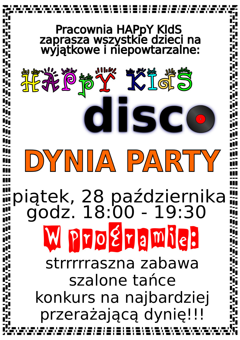 Pracownia HAPpY KidS zaprasza wszystkie dzieci na szalone "Dynia Party". Impreza odbędzie się 28 pażdziernika 2016 roku w godzinach 18.00 - 19.30. W programie tańce, zabawy, konkurs na "najstraszniejszą dynię"! Jeśli lubicie dobrą zabawę w strrrrasznych klimatach - ZAPRASZAMY!