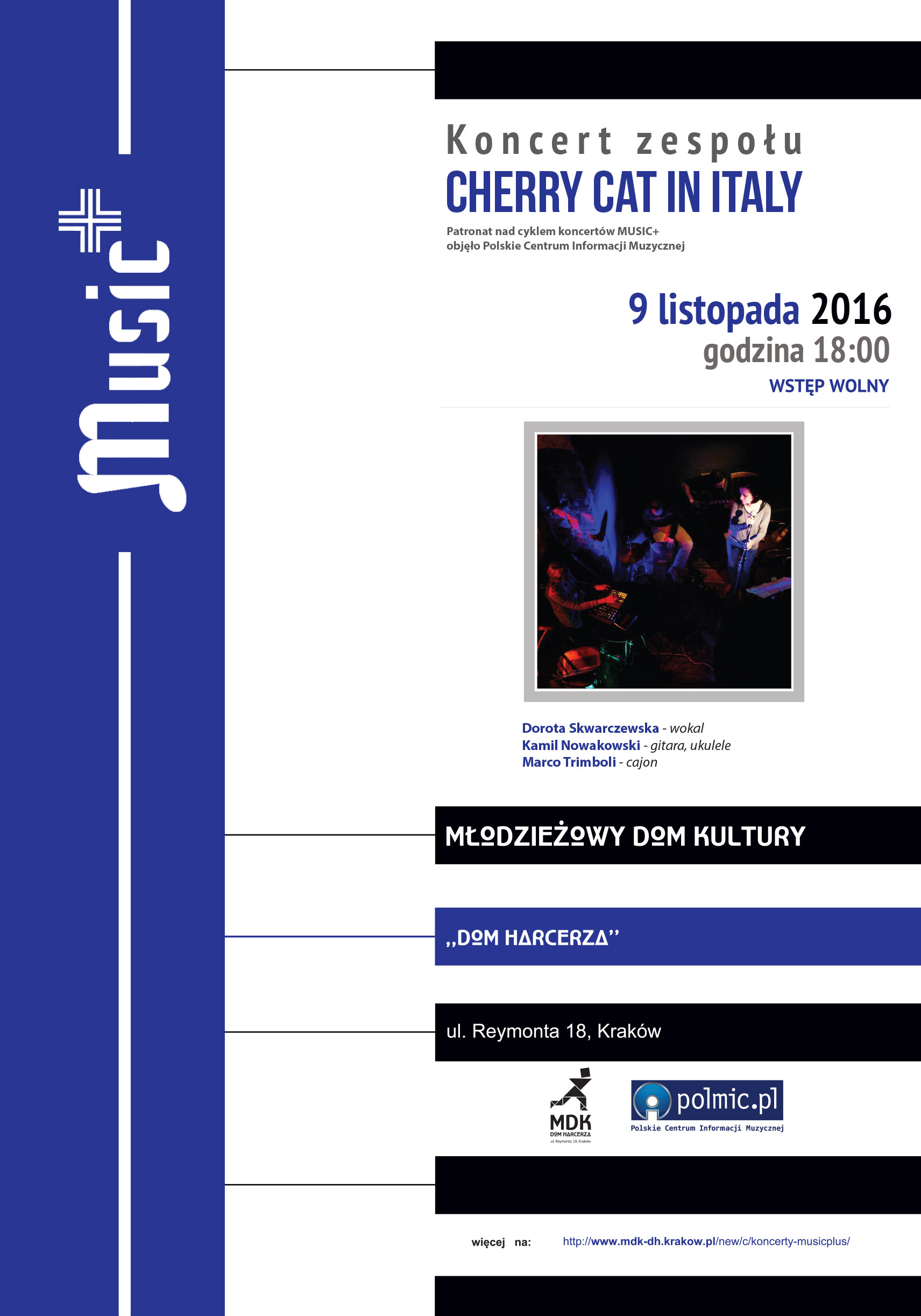 „Cherry cat in Italy” poznali się na kiepskim koncercie i postawili sobie wyzwanie, że za miesiąc sami zagrają koncert. Udało się! Od maja 2014 roku grają muzykę nieoczywistą. Skład: Dorota Skwarczewska - wokal, Kamil Nowakowski - gitara, ukulele, Marco Trimboli z Włoch - cajon.