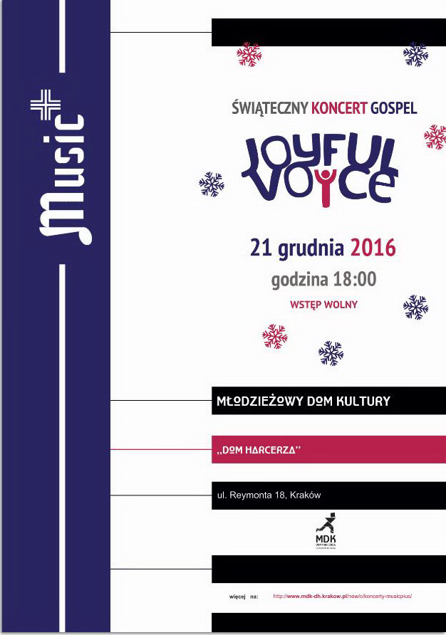 21 grudnia 2016 roku o godz. 18.00 zapraszamy do Młodzieżowego Domu Kultury „Dom Harcerza” przy ul. Reymonta 18 na kolejny koncert z cyklu Music+.