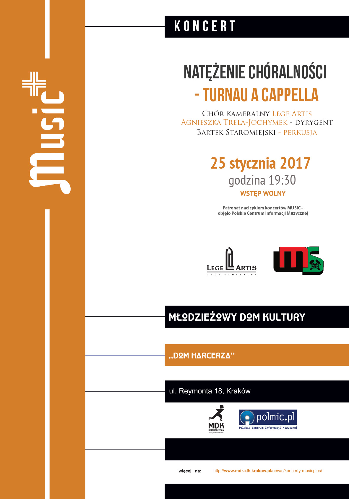 25 stycznia 2017 roku o godz. 19.30 zapraszamy do Młodzieżowego Domu Kultury „Dom Harcerza” przy ul. Reymonta 18 na koncert chóru kameralnego „Lege Artis”.