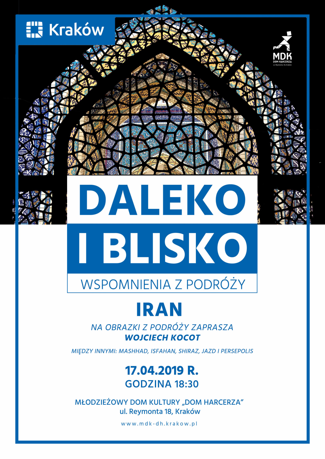 17 kwietnia 2019 roku o godz. 18.30 zapraszamy do MDK „Dom Harcerza” na kolejne spotkanie Cyklu Podróżniczego „Daleko i blisko - wspomnienia z podróży". O swej wyprawie do opowie Iranu Wojciech Kocot. Wstęp wolny!
