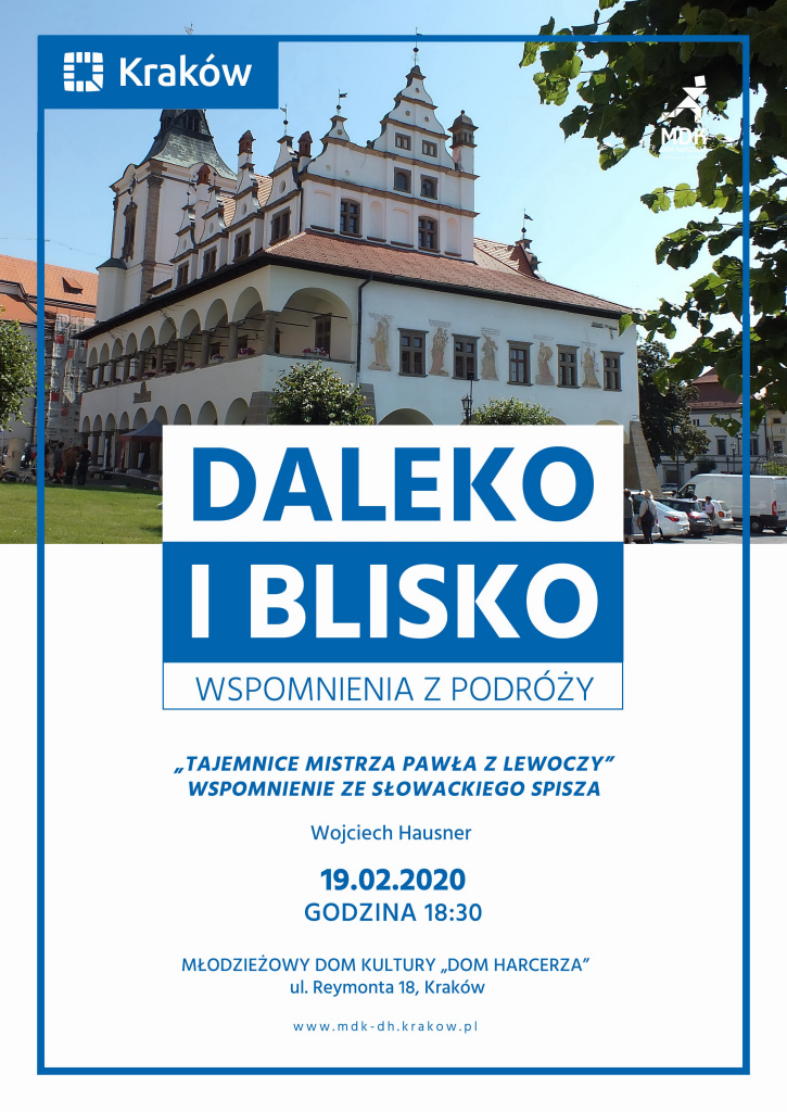 19 lutego 2020 roku o godz. 18.30 zapraszamy do MDK „Dom Harcerza” na kolejne spotkanie Cyklu Podróżniczego „Daleko i blisko - wspomnienia z podróży" pt. „TAJEMNICE MISTRZA PAWŁA Z LEWOCZY - WSPOMNIENIE ZE SŁOWACKIEGO SPISZA". Pokaz poprowadzi Wojciech Hausner. Wstęp wolny!