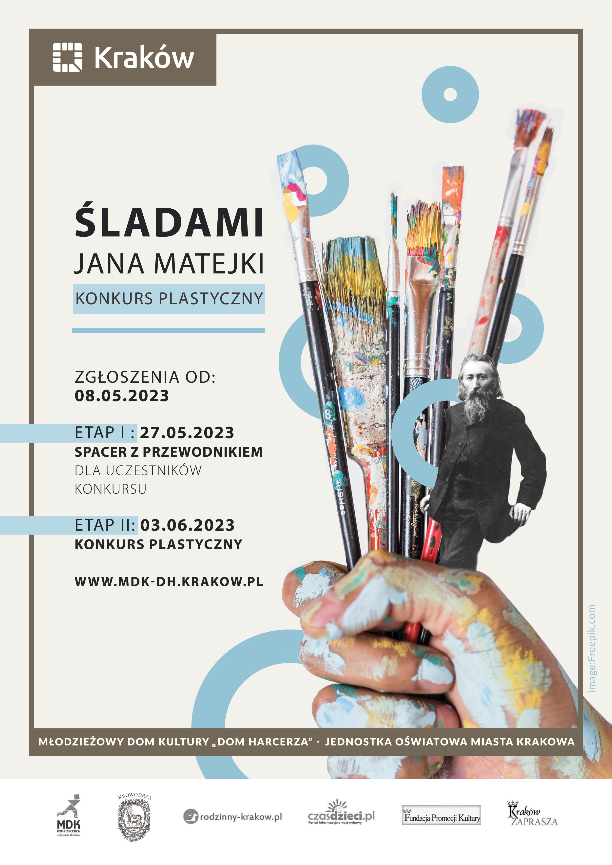 Uczestnictwo w konkursie składa się z dwóch części: w pierwszej kolejności 27.05.2023 r. o godzinie 11:30 uczestnicy wraz z opiekunami wezmą udział w spacerze po Krakowie, który przybliży im postać Jana Matejki oraz jego znaczenia dla naszego miasta. Kolejny etap to wykonanie pracy plastycznej — rozpocznie się 03.06.2023 r. o godzinie 10:00. Na terenie MDK „DH” uczestnicy wykonają prace inspirowane twórczością Jana Matejki „pod okiem” nauczycieli naszej pracowni plastycznej. Każdy uczestnik otrzyma do wykonania pracy konkursowej podobrazie, na którym będzie znajdował się fragment reprodukcji dzieła Jana Matejki — inny dla każdego konkursowicza. Podobrazia będą przydzielane w drodze losowania. Uczestnicy powinni stworzyć swoje własne, oryginalne prace, których punktem wyjścia będzie twórczość mistrza. Czas na wykonanie prac to 1,5 godziny. Uczestnicy będą korzystać z materiałów plastycznych zapewnionych przez organizatora.