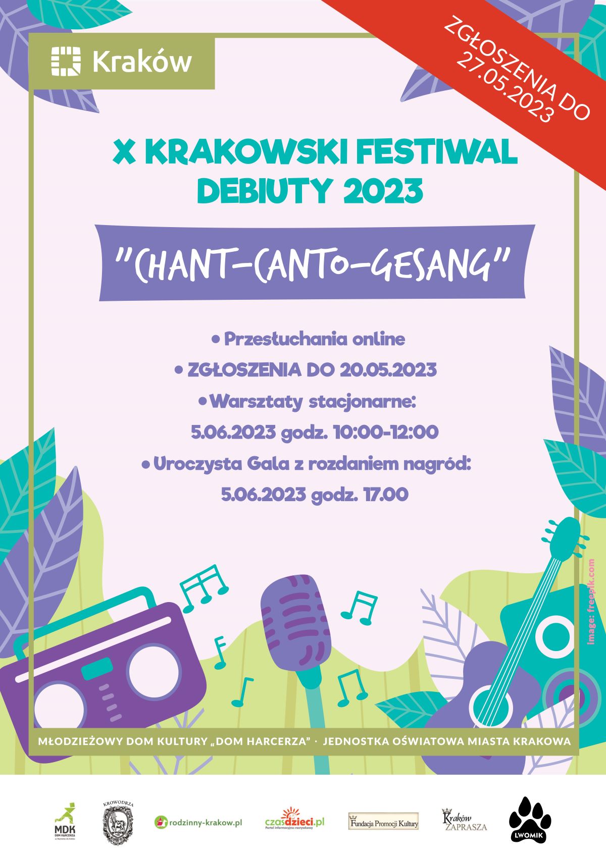 Młodzieżowy Dom Kultury „Dom Harcerza” zaprasza dzieci i młodzież do wzięcia udziału w X Krakowskim Festiwalu Debiuty 2023 „CHANT-CANTO-GESANG”.
