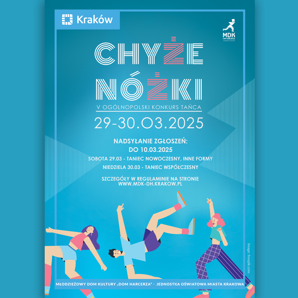 Młodzieżowy Dom Kultury „Dom Harcerza” w Krakowie serdecznie zaprasza na jubileuszową, piątą edycję Ogólnopolskiego Konkursu Tańca „Chyże Nóżki”! To wyjątkowe wydarzenie taneczne odbędzie się w dniach 29–30 marca 2025 roku w naszej hali sportowej przy ul. Reymonta 18.