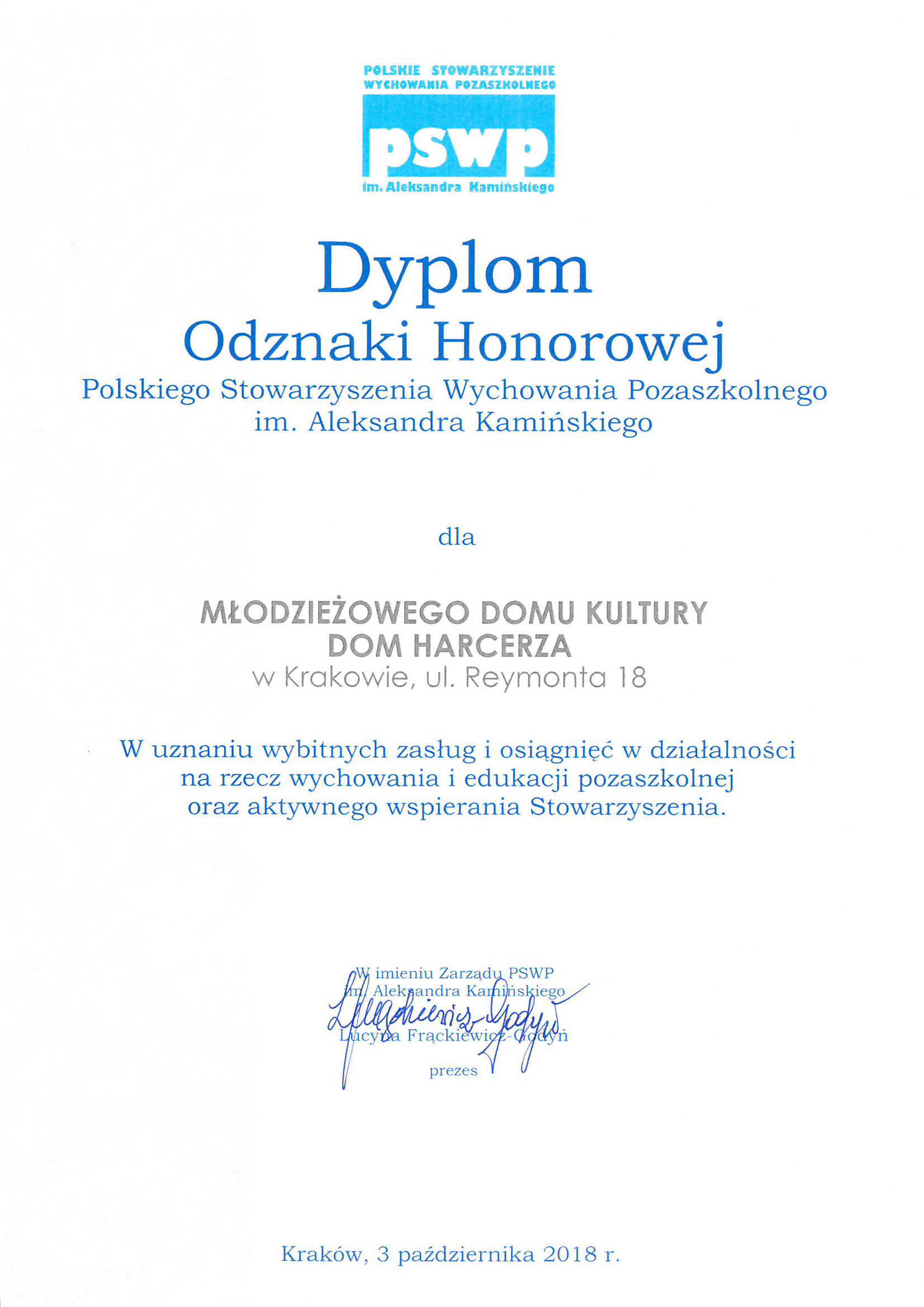 Mamy przyjemność poinformować, że 3 pażdziernika 2018 roku Młodzieżowy Dom Kultury „Dom Harcerza" otrzymał Odznakę Honorową Polskiego Stowarzyszenia Wychowania Pozaszkolnego im. Aleksandra Kamińskiego.
