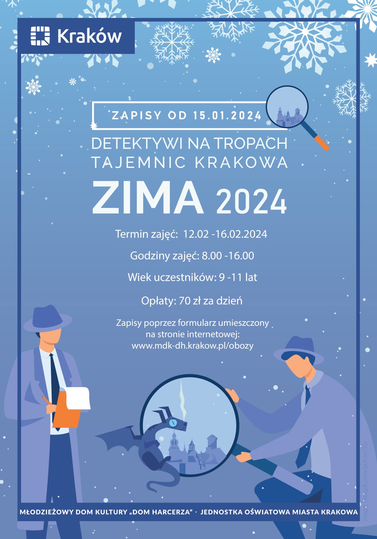 Zapraszamy dzieci w wieku od 9 do 11 lat na zimowe zajęcia Detektywi na tropach tajemnic Krakowa. Zajęcia odbędą się w terminie od 12.02 do 16.02.2024 r. od poniedziałku do piątku w godzinach 8.00 - 16.00, w budynku MDK „Dom Harcerza" przy ul. Reymonta 18.