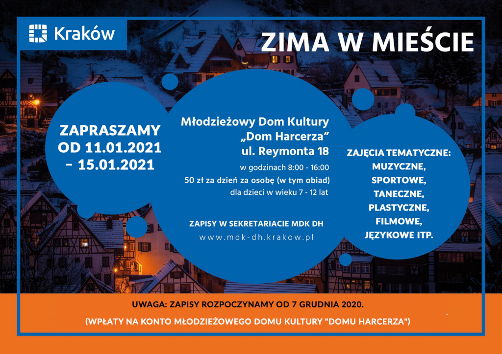 Zajęcia będą się odbywać w terminie 11.01 - 15.01.2021 r., od poniedziałku do piątku w godzinach 8.00 - 16.00, w budynku MDK „Dom Harcerza”, ul. Reymonta 18.