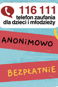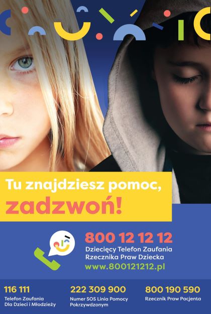 Uprzejmie informujemy, że ogólnopolska infolinia dla dzieci i młodzieży oraz ich opiekunów POMAGAMY (800 800 605) od 1 listopada br. zastąpiona będzie telefonem zaufania Rzecznika Praw Dziecka. Nowy bezpłatny numer, pod którym dzieci i młodzież będą mogły otrzymać wsparcie psychologiczne, to 800 12 12 12. Telefon i czat internetowy będą czynne przez całą dobę, siedem dni w tygodniu. Czat nie wymaga logowania oraz instalowania żadnej aplikacji. Połączenia telefonicznie nadal pozostaną bezpłatne, a rozmówcy będą mieli zapewnioną dyskrecję i anonimowość.