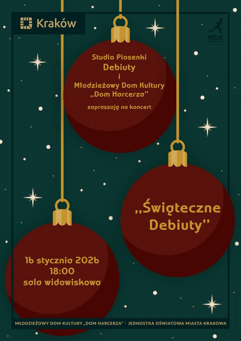Studio Piosenki „Debiuty” i Młodzieżowy Dom Kultury „Dom Harcerza” serdecznie zapraszają na koncert „Świąteczne Debiuty” Na scenie zaprezentują się młodzi wokaliści Studia Piosenki Debiuty, którzy w świątecznym repertuarze podsumują swoją… -