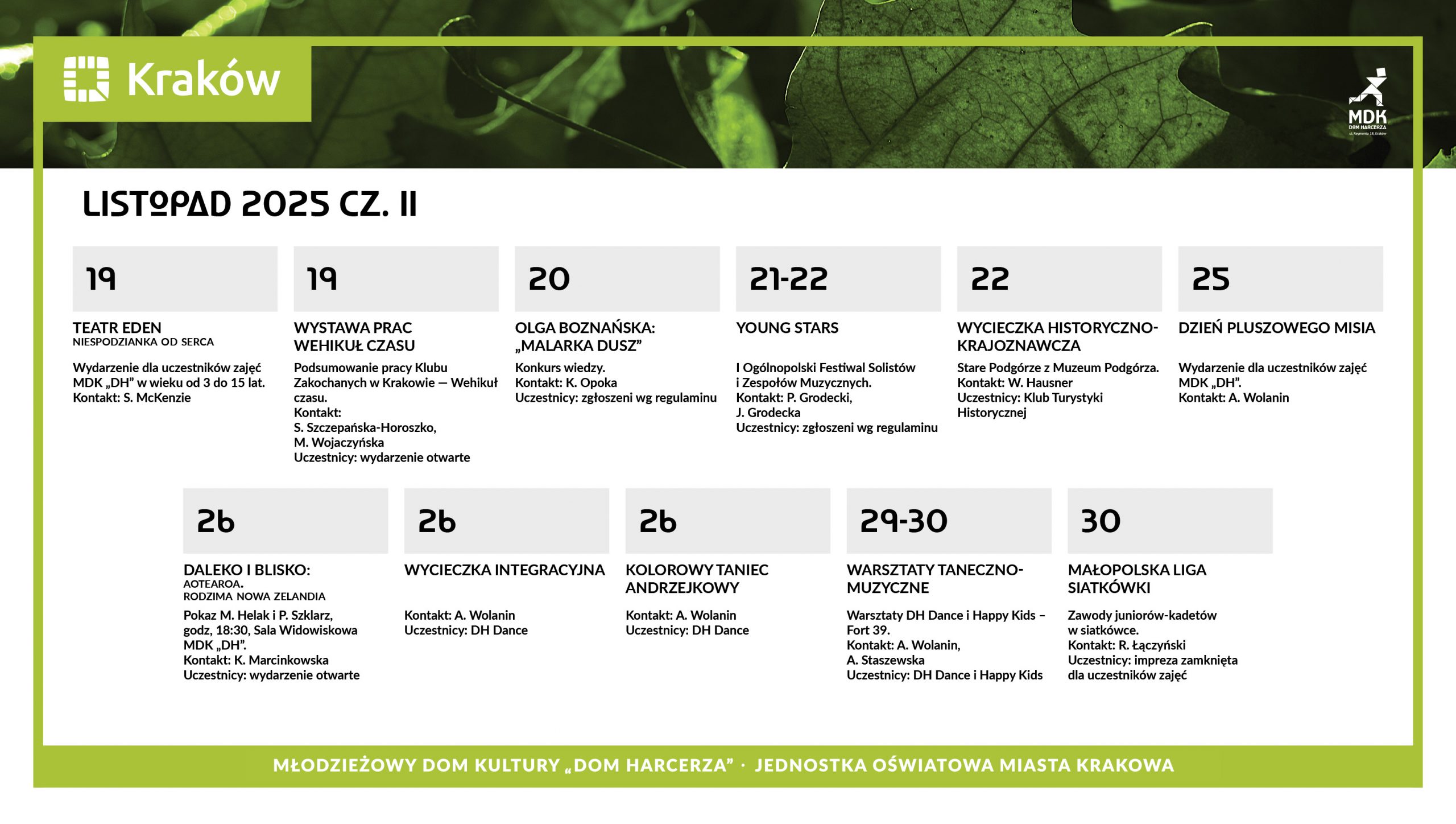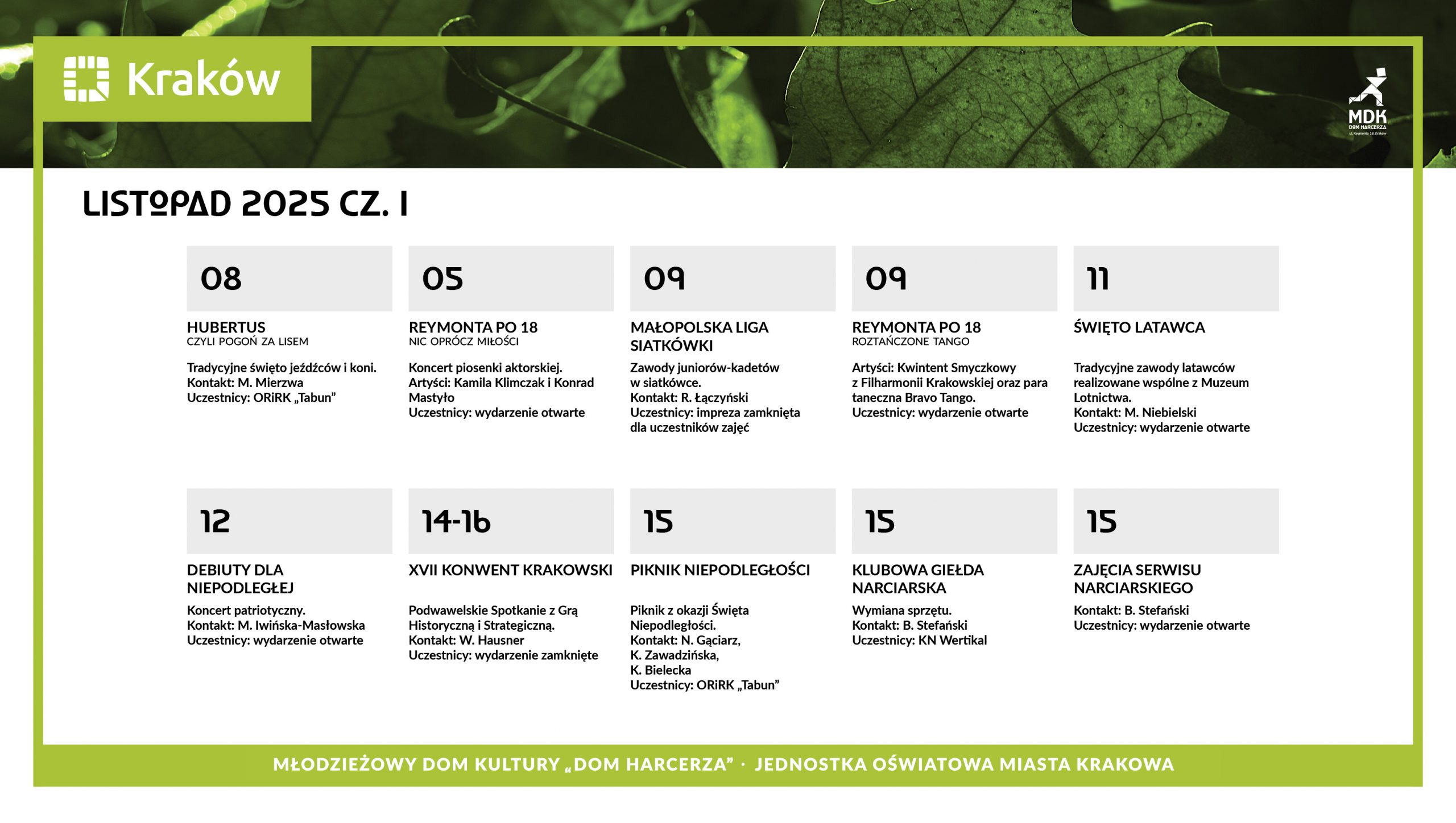 Na obrazku widać harmonogram wydarzeń na październik 2025 w MDK Dom Harcerza