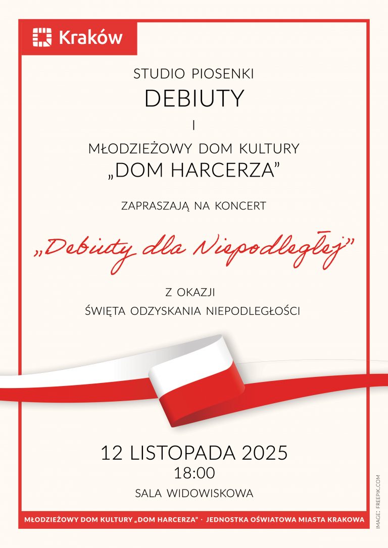 Studio Piosenki „Debiuty” i Młodzieżowy Dom Kultury „Dom Harcerza” serdecznie zapraszają na wyjątkowy koncert: „Debiuty dla Niepodległej”z okazji Święta Odzyskania Niepodległości W programie koncertu młodzi artyści ze Studia Piosenki „Debiuty”… -