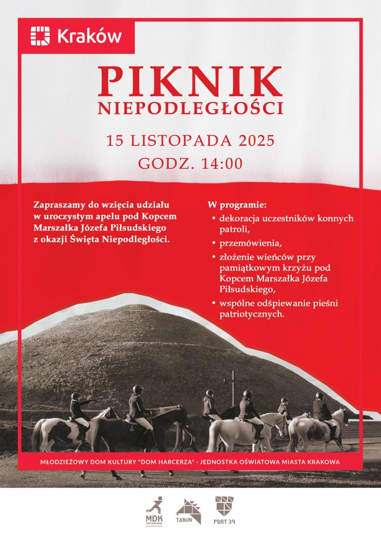 Zapraszamy na uroczystość pod Kopcem Marszałka Józefa Piłsudskiego Młodzieżowy Dom Kultury „Dom Harcerza” oraz ORIRK „TABUN” serdecznie zapraszają na wyjątkowe obchody Święta Niepodległości. Spotkajmy się 15 listopada, by wspólnie oddać… -
