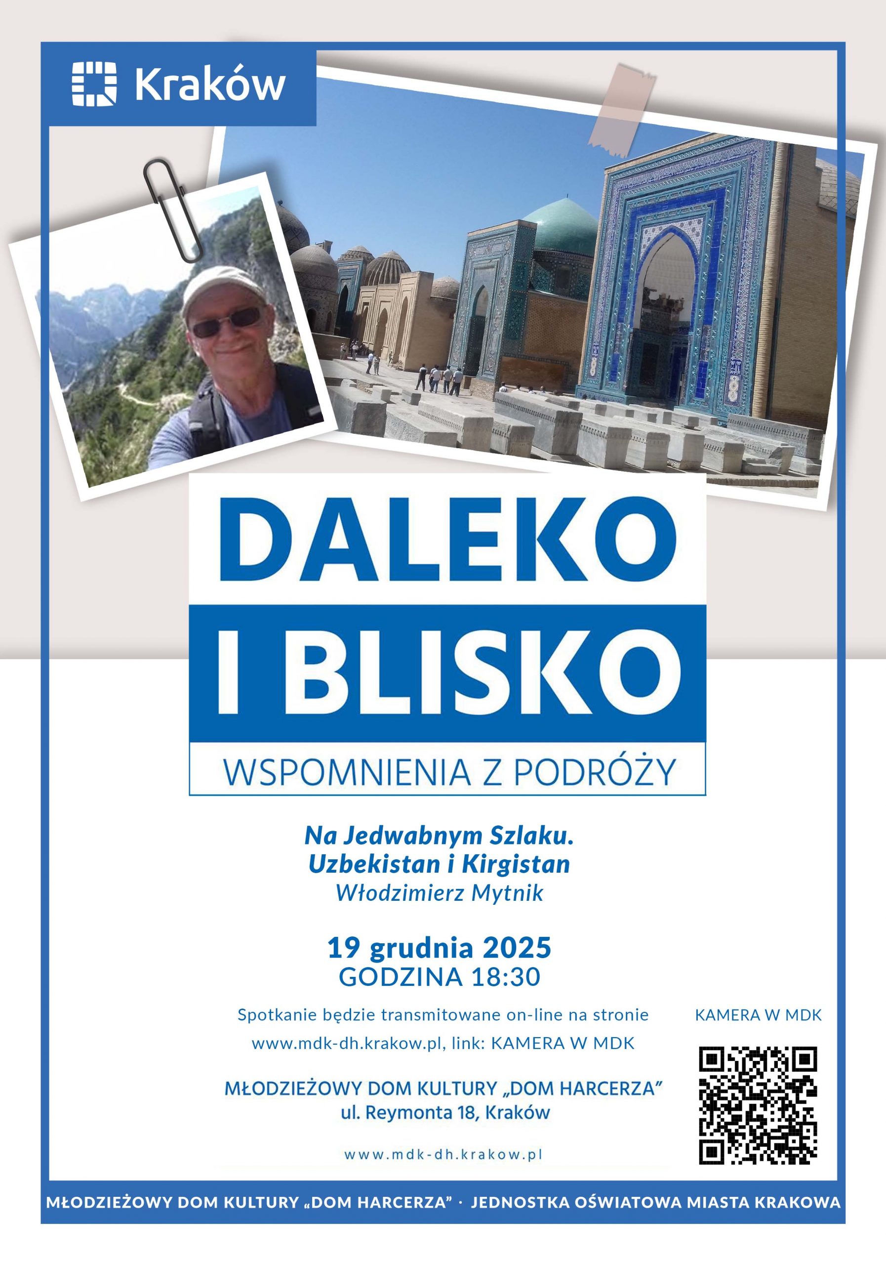 19 grudnia (wyjątkowo piątek!) o 18:30 w sali widowiskowej MDK „Dom Harcerza” na ul. Reymonta 18 zapraszamy na kolejne spotkanie z naszego cyklu podróżniczego! Tym razem powróci do nas Włodzimierz Mytnik. Opowie nam o swoich podróżach po Uzbekistanie i Kirgistanie.