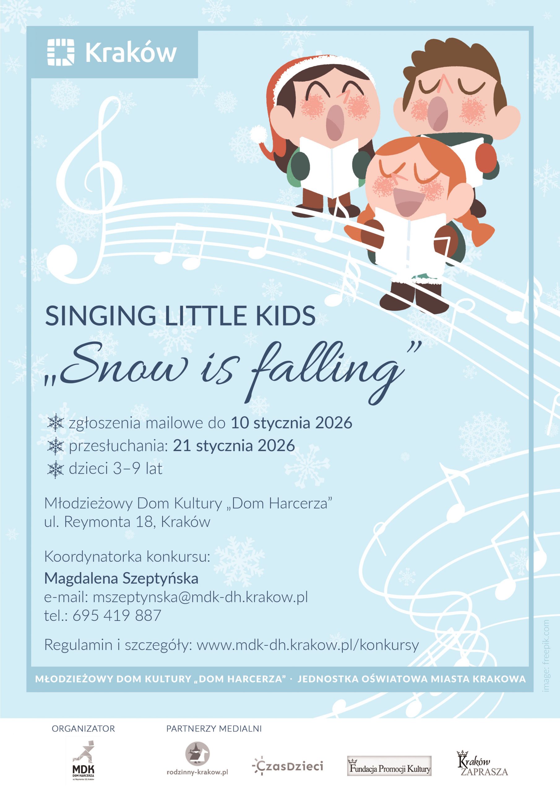 Młodzieżowy Dom Kultury „Dom Harcerza” ul. Reymonta 18 w Krakowie zaprasza do udziału w Konkursie Piosenki Angielskiej „Singing Little Kids – Snow is falling”.