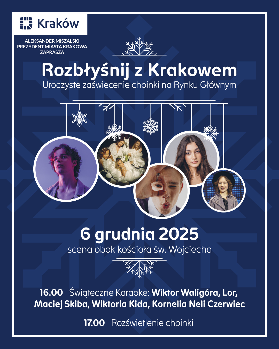 Świąteczne drzewko rozbłyśnie o godzinie 17.00, a wcześniej publiczność weźmie udział w największym świątecznym karaoke w Polsce, przygotowanym przez Miasto Kraków i radio RMF FM. Wspólnie z artystami obecnymi na antenie RMF FM – Wiktorem Waligórą, Lor, Wiktorią Kidą, Maciejem Skibą oraz krakowską debiutantką Kornelią Neli Czerwiec – będzie można zaśpiewać najpopularniejsze świąteczne utwory.