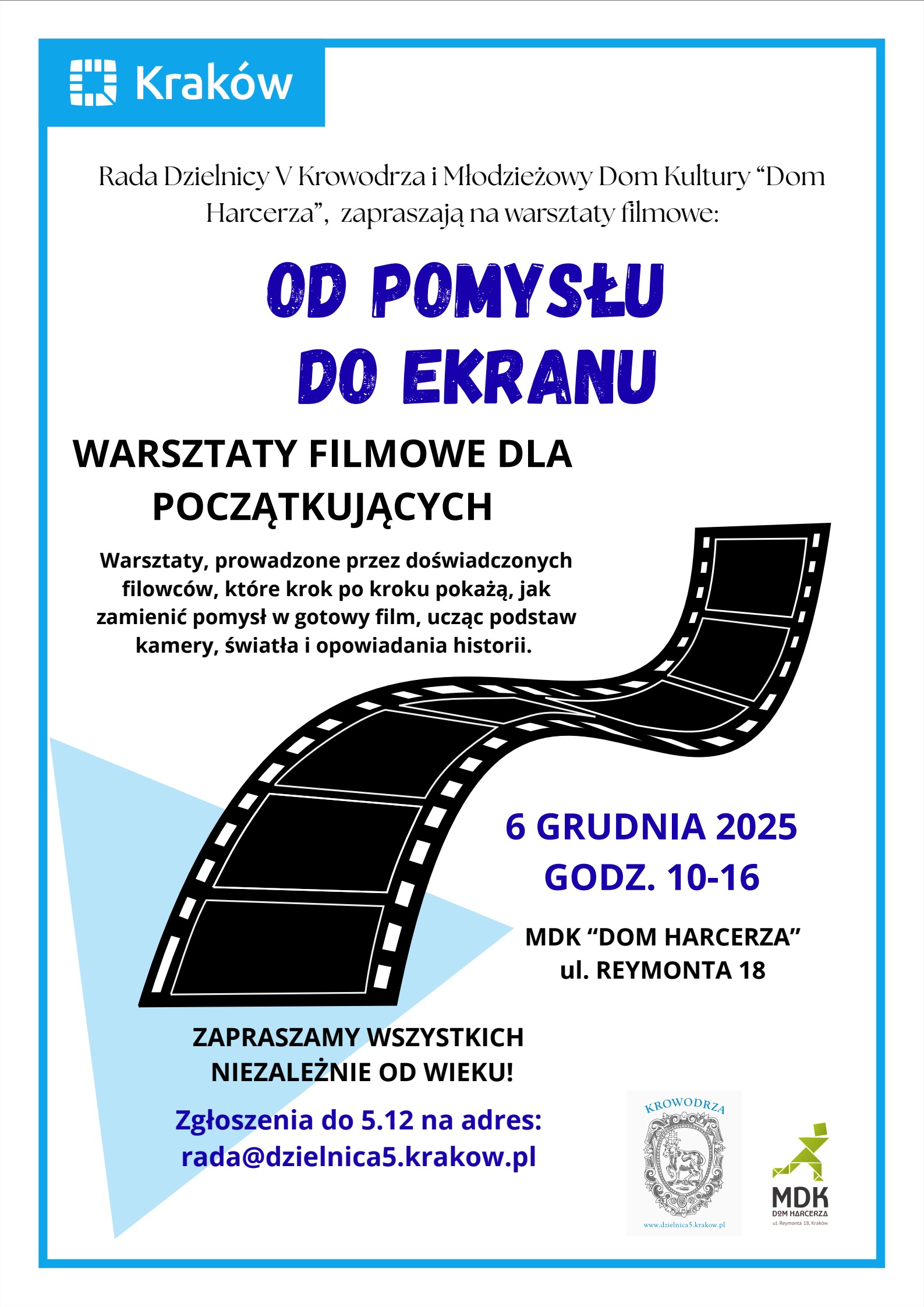 Rada Dzielnicy V Krowodrza oraz Młodzieżowy Dom Kultury „Dom Harcerza” Reymonta 18 zapraszają na warsztaty filmowe, które odbędą się 6 grudnia 2025 r. w godz. 10-16 w siedzibie MDK przy ul. Reymonta 18.
