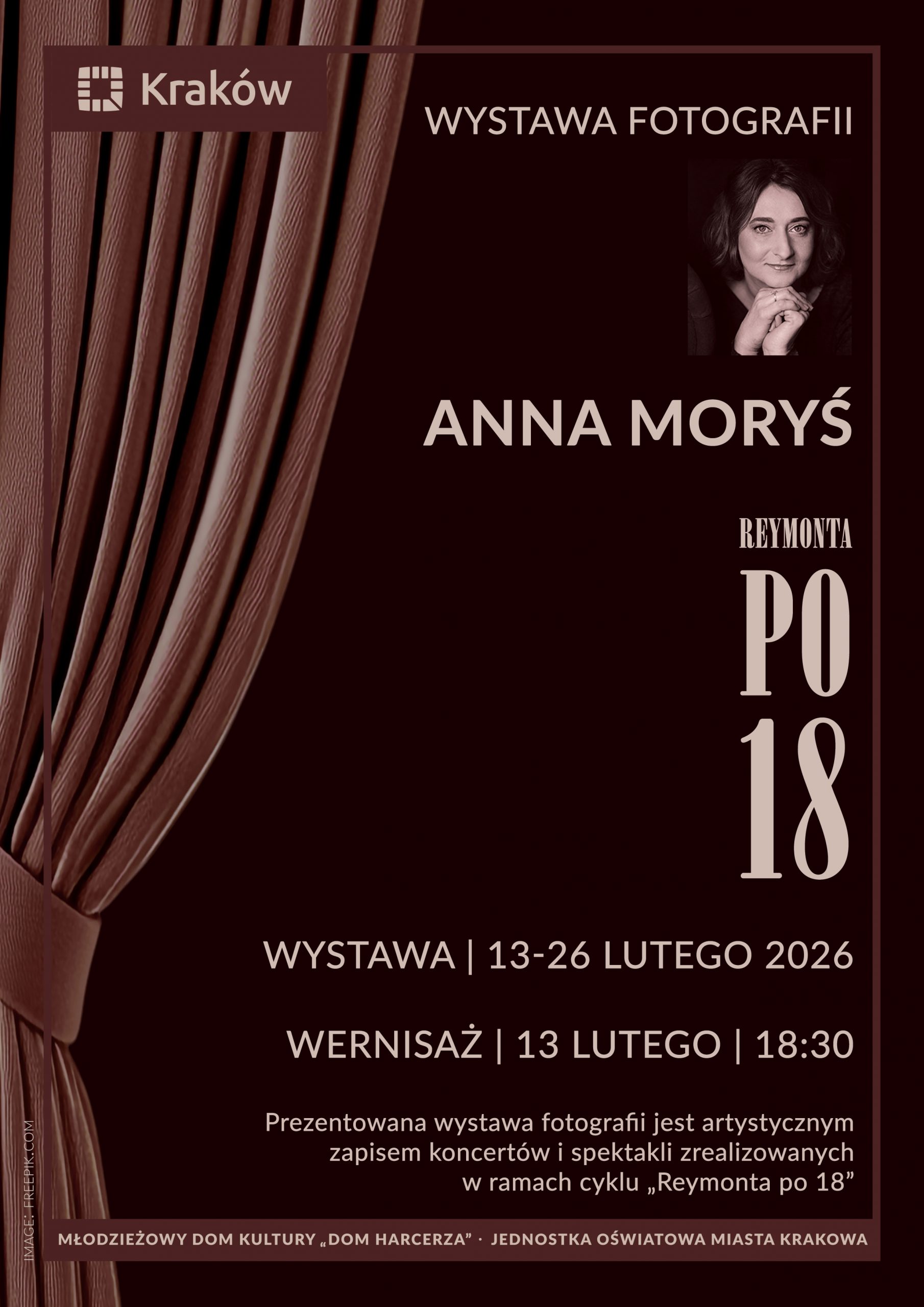Młodzieżowy Dom Kultury „Dom Harcerza” zaprasza na wernisaż wystawy fotografii autorstwa Anny Moryś, zrealizowanych podczas cyklu wydarzeń artystycznych „Reymonta po 18”.
