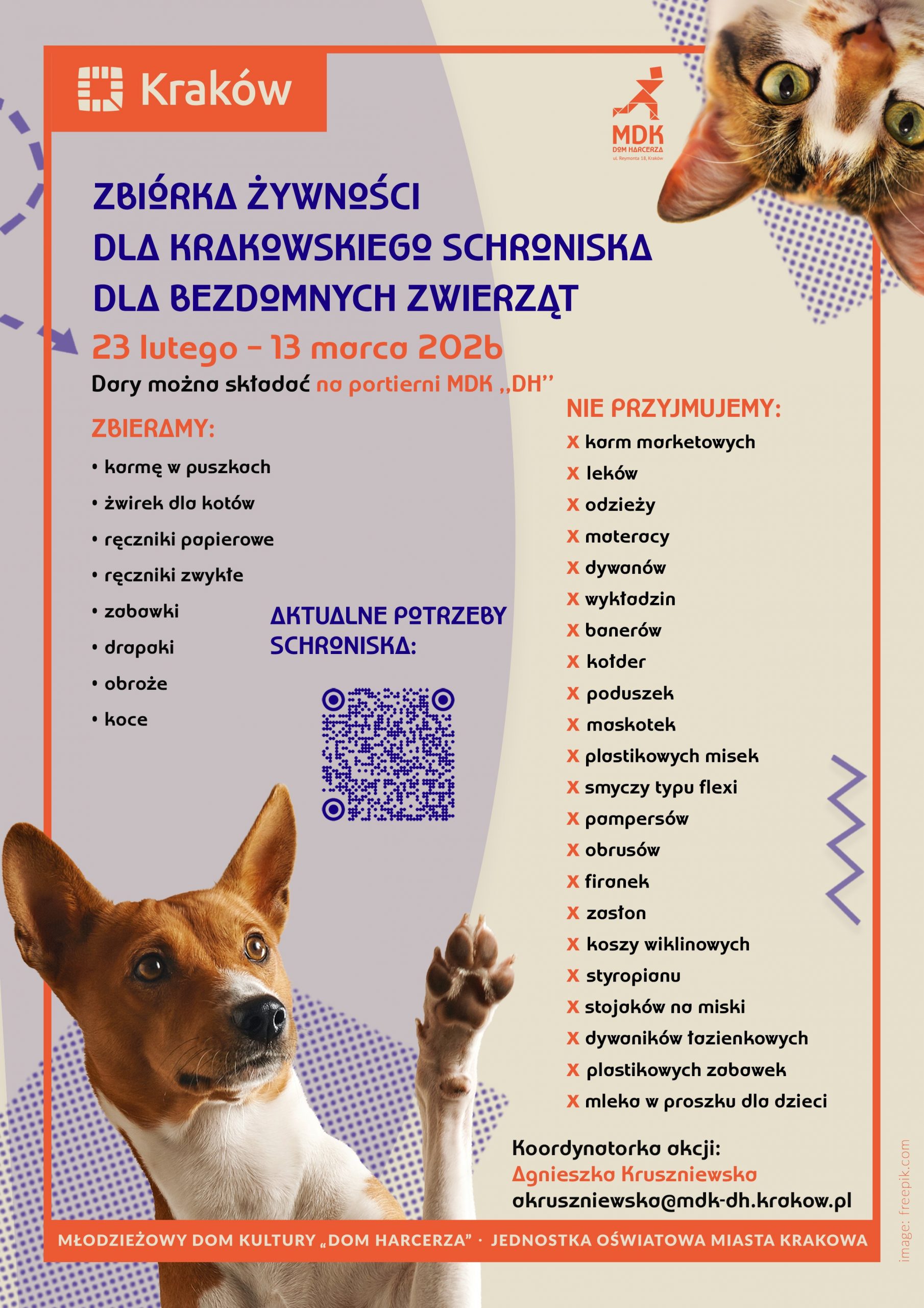W dniach 23 lutego – 13 marca 2026 r. w Młodzieżowym Domu Kultury „Dom Harcerza” przy ul. Reymonta 18 w Krakowie prowadzona będzie zbiórka darów dla Krakowskiego Schroniska dla Bezdomnych Zwierząt.